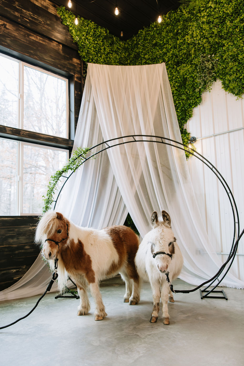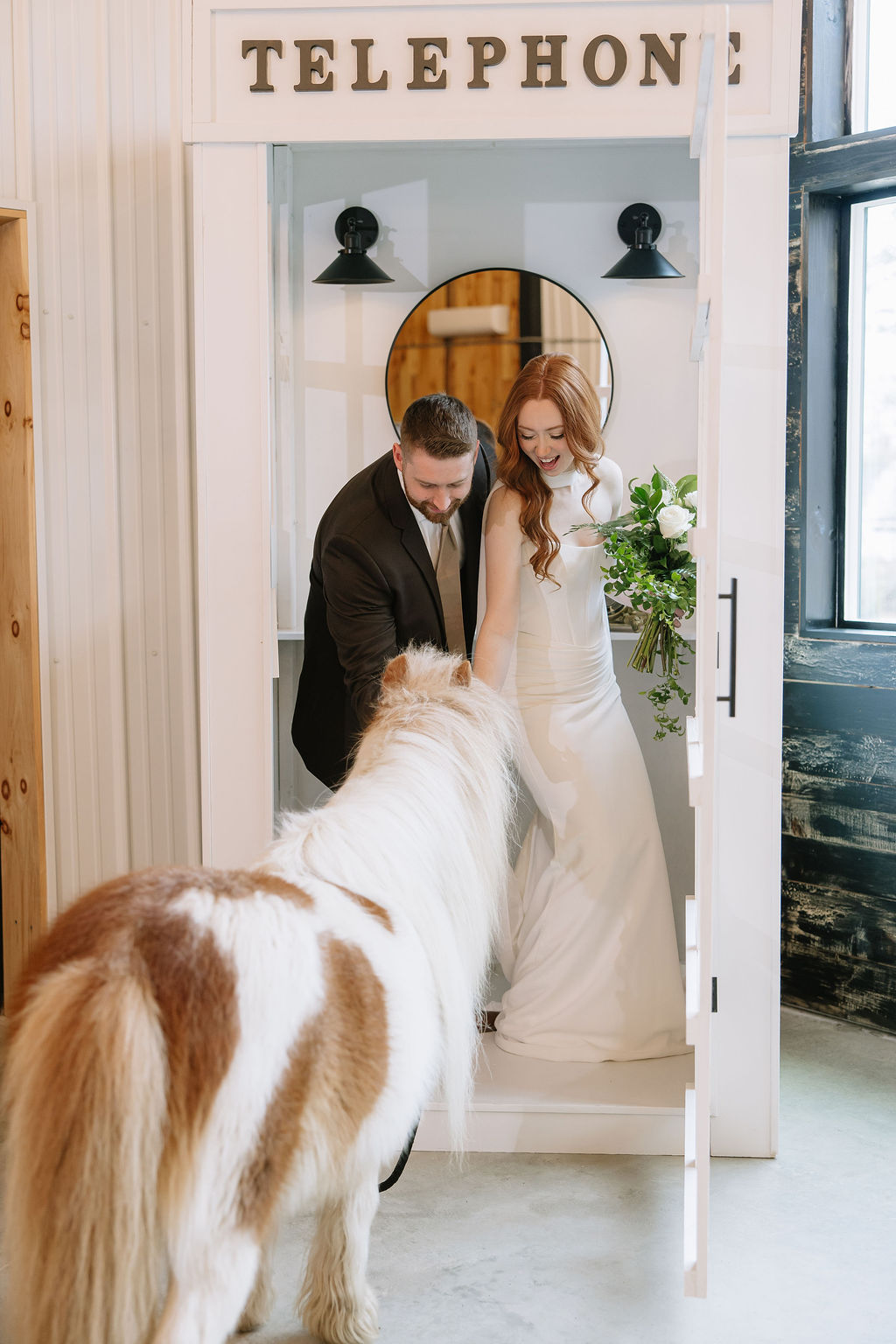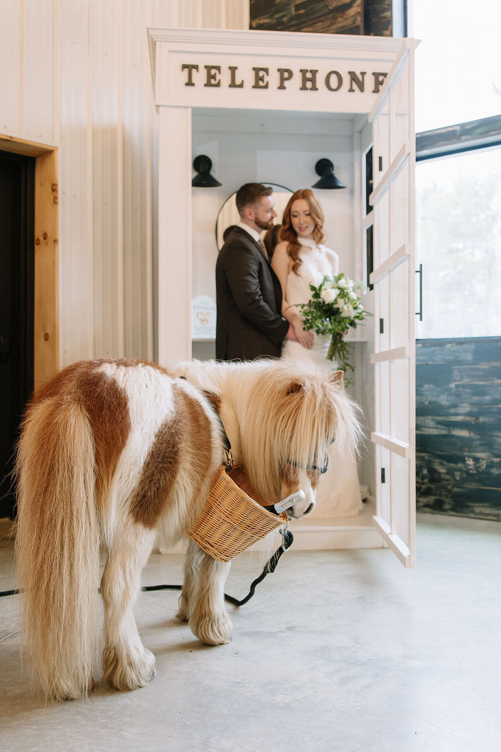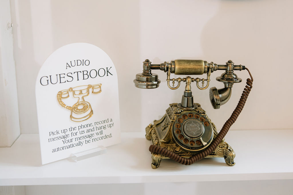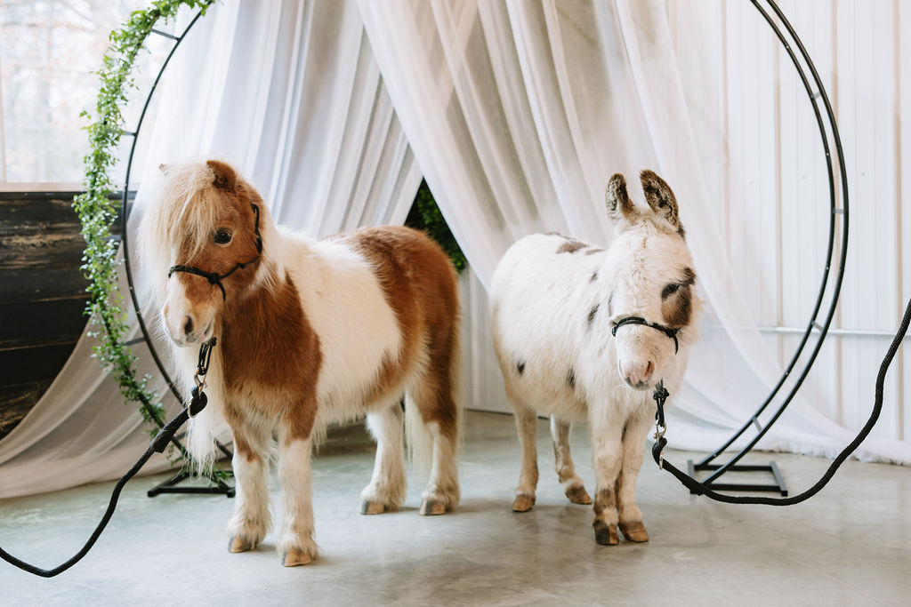 Guests record messages through a vintage telephone guest book, gather around a custom cocktail bar, and interact with mini horses and a donkey - small moments that add exceptional experiences.